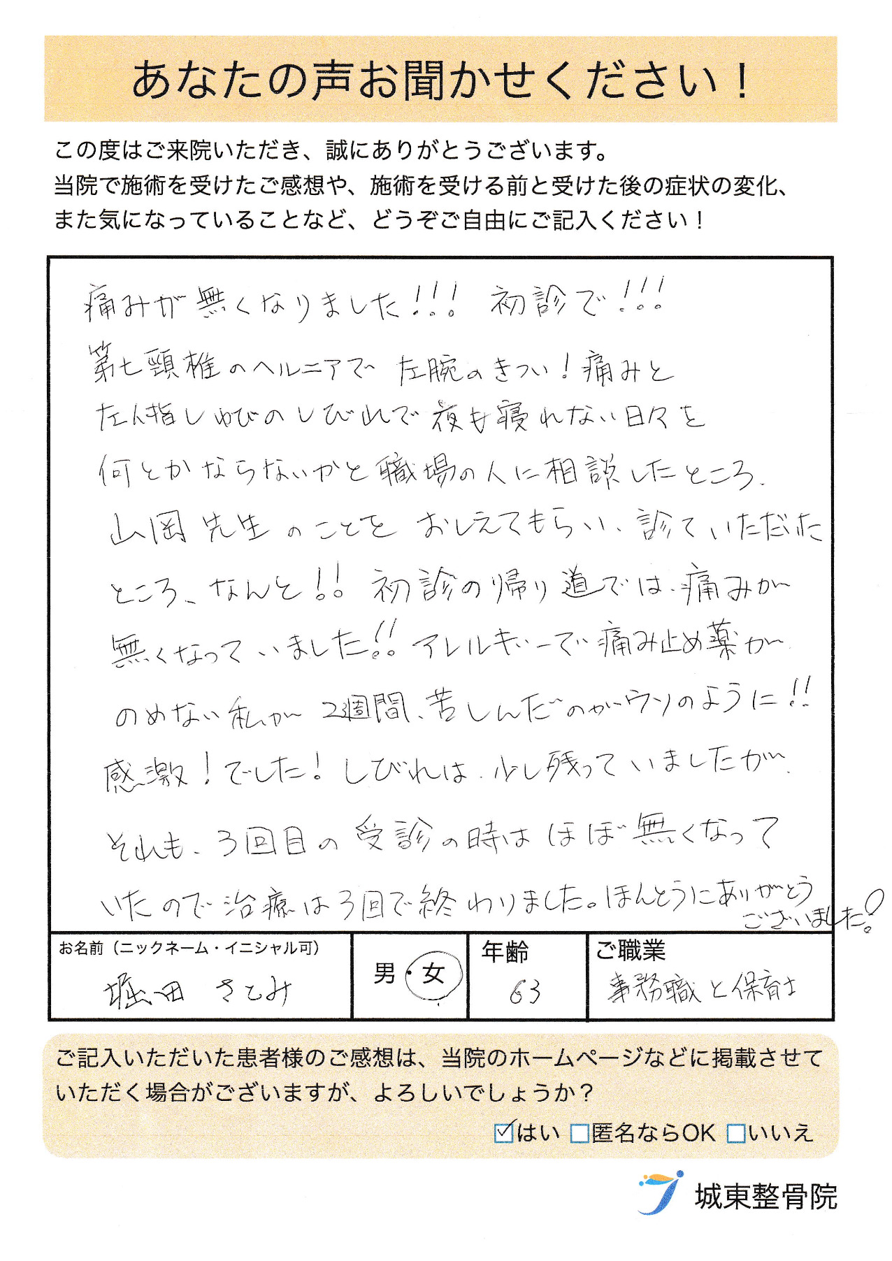 今回ご感想をいただいた患者さんも頚椎ヘルニアからの左腕のきつい痛みと痺れに悩まされておりました。