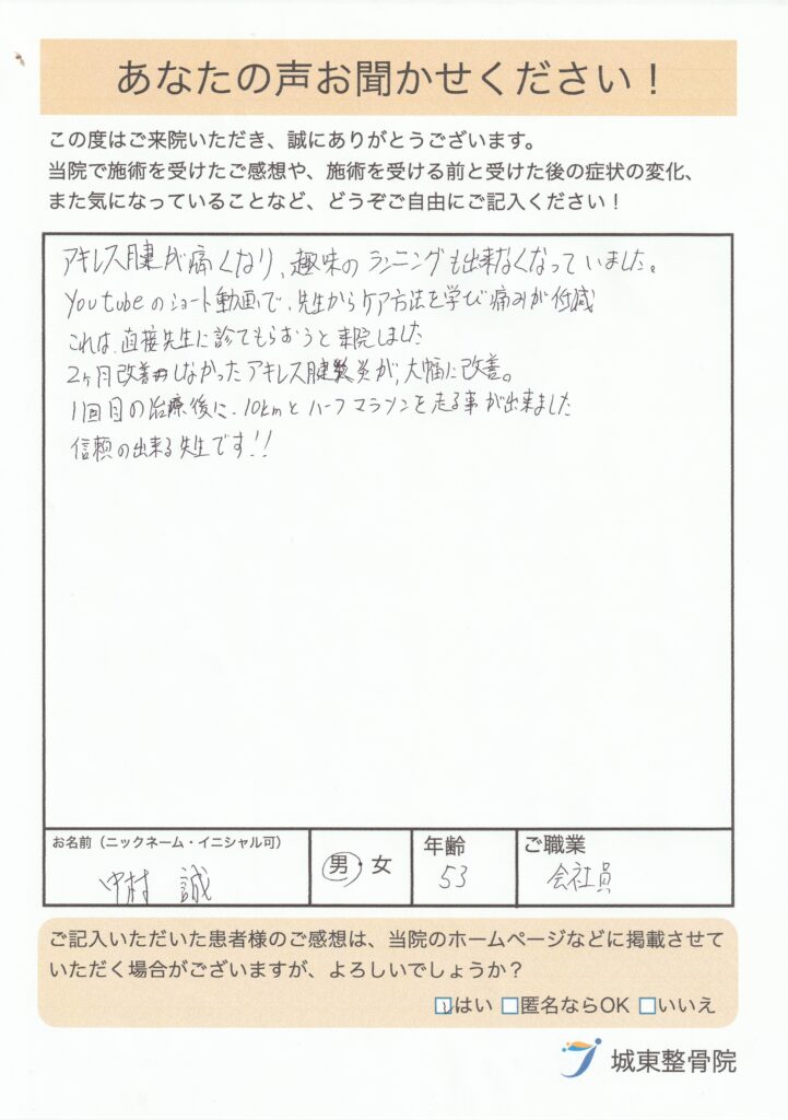 今回、Youtubeのショート動画をご覧になって来院された患者さんから、アキレス腱炎の治療の感想をいただきました。