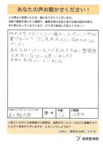 治療後は痛みがかなり軽減し、屈伸が可能になりました。